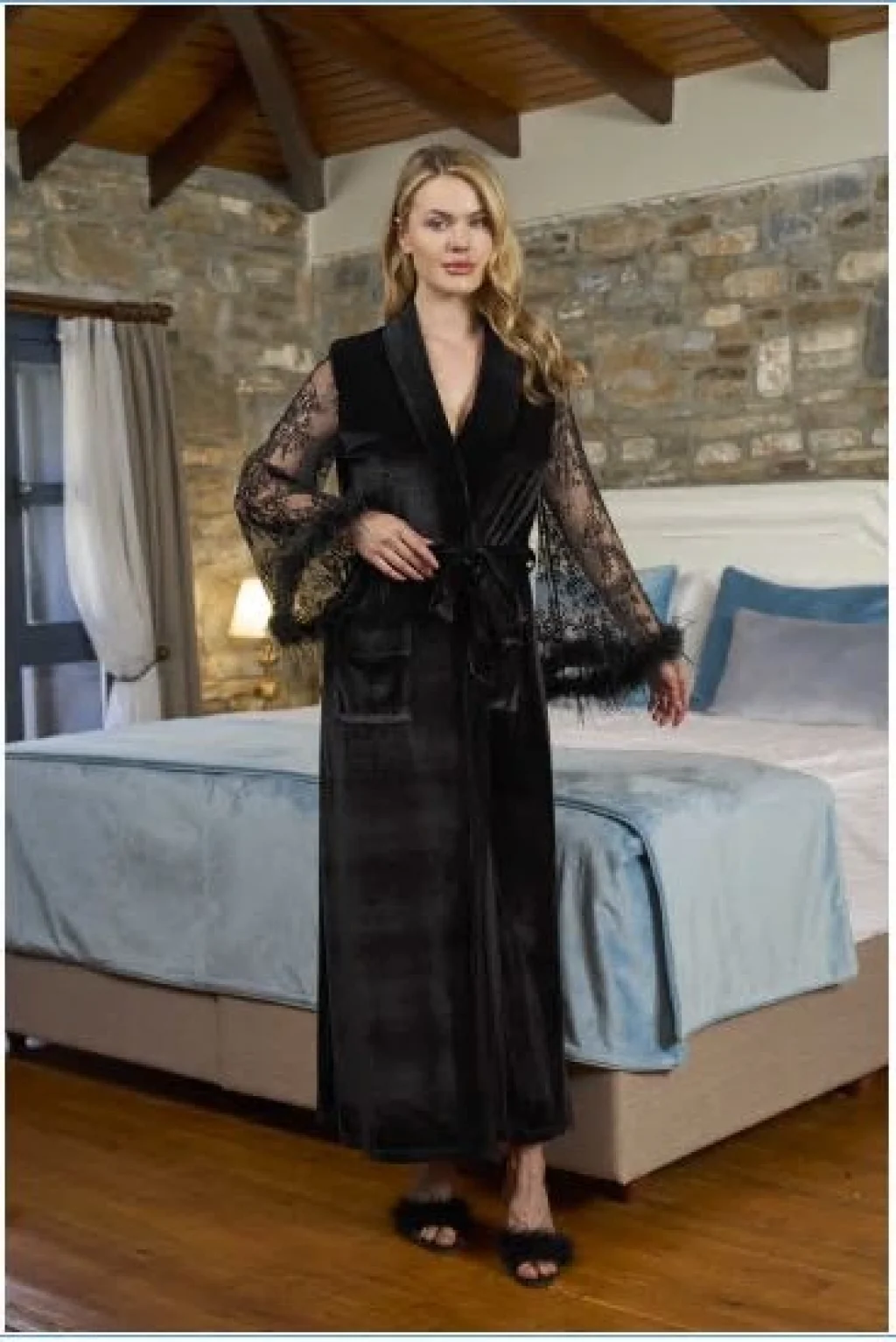 Aqua 26353 Dantelli Ve Ortişli Kadife Sabahlık