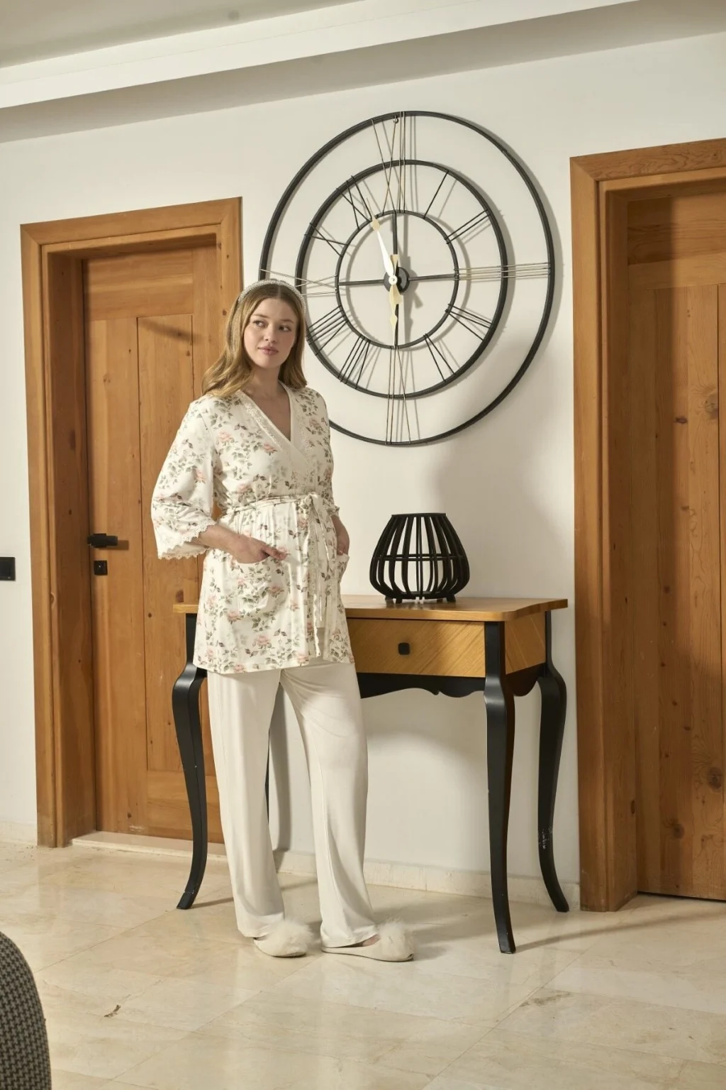 Effortt 4054 Biye Detaylı Sabahlıklı Lohusa Pijama Takımı