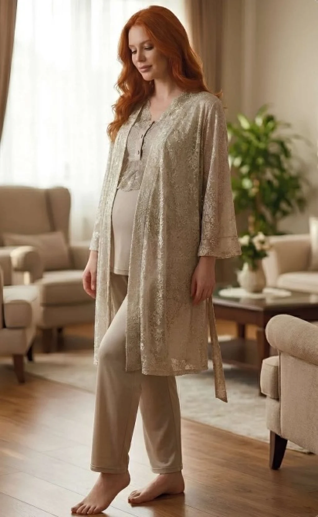 Bone 6205 Kadın 3'lü Jakarlı Sabahlıklı Lohusa Pijama Takımı