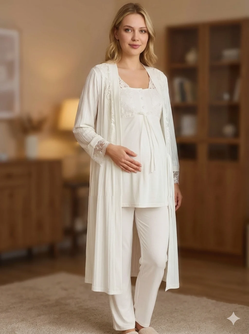 Bone 6205 Kadın 3'lü Jakarlı Sabahlıklı Lohusa Pijama Takımı