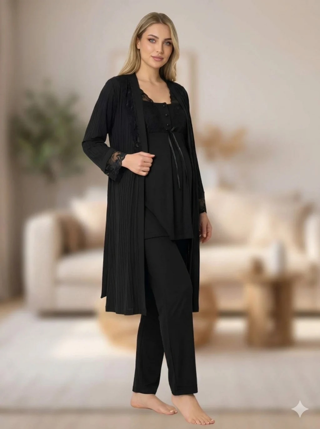 Bone 6205 Kadın 3'lü Jakarlı Sabahlıklı Lohusa Pijama Takımı