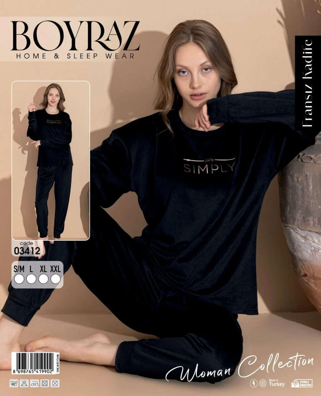 Boyraz 03412 Fransız Kadife Kumaş Uzun Kol Pijama Takımı