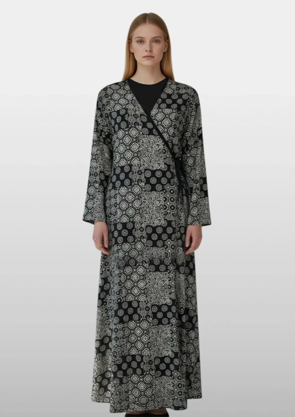 Aqua 26383 Kadın Uzun Kol Desenli Midi Büyük Beden Gecelik