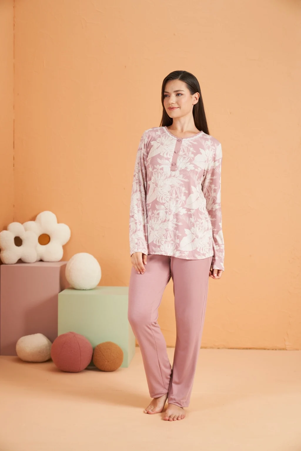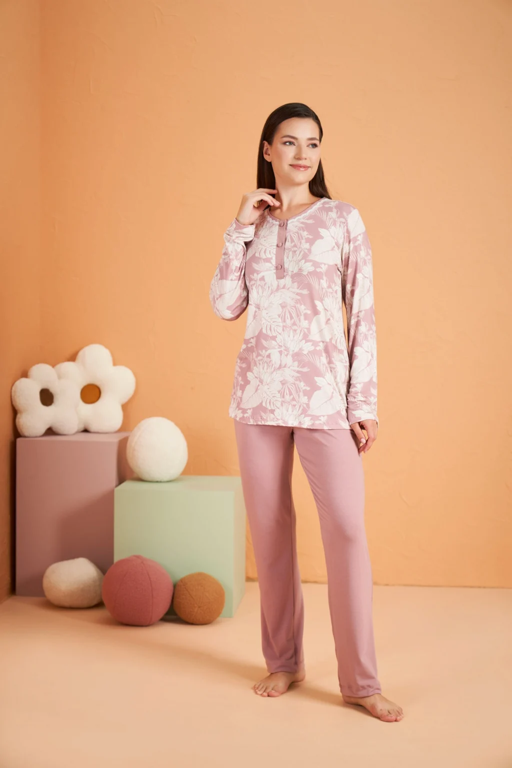 PJS 28016 Kadın Uzun Kol Yarı Patlı Desenli Pijama Takım