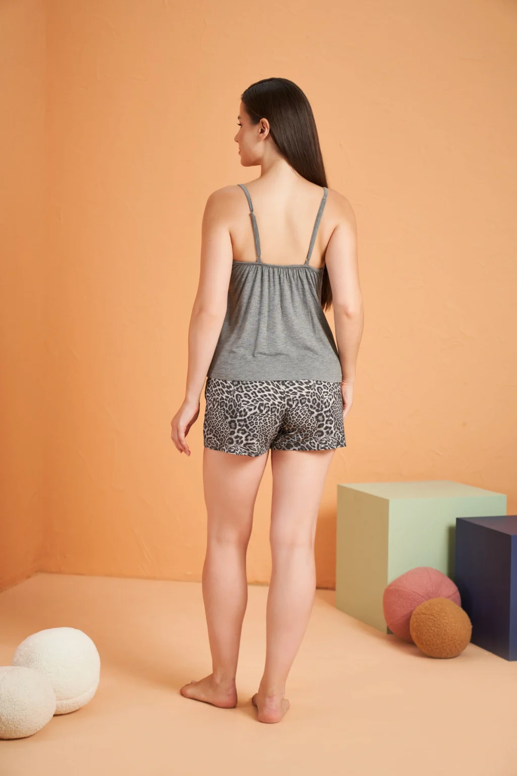 PJS 28043 Kadın İp Askılı Leopar Desenli Şort Takım